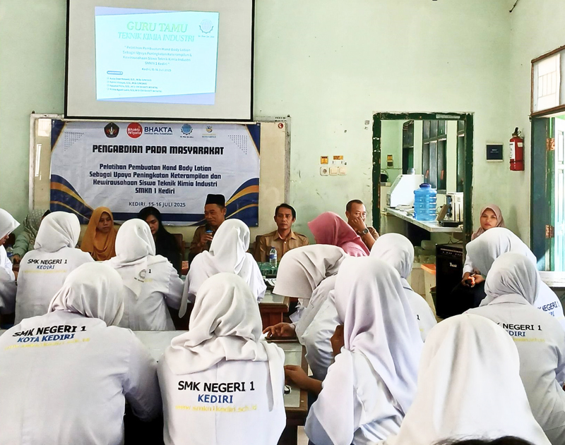 Edy Suroto, S.Pd.M.M., selaku Kepala Sekolah SMKN 1 Kota Kediri, dalam sambutannya menekankan pentingnya kegiatan ini. “Pelatihan ini sangat penting untuk meningkatkan kompetensi siswa kami di bidang kimia industri. Mereka tidak hanya belajar tentang reaksi kimia, tetapi juga memahami standar kualitas, kebersihan, dan keamanan dalam produksi kosmetik. Ini adalah bekal berharga untuk karir mereka di masa depan,” ujarnya. Hal senada juga disampaikan oleh Setiyono, S.Pd T, Waka Kurikulum SMKN 1 Kediri, yang turut mendukung penuh pelaksanaan pelatihan ini.
