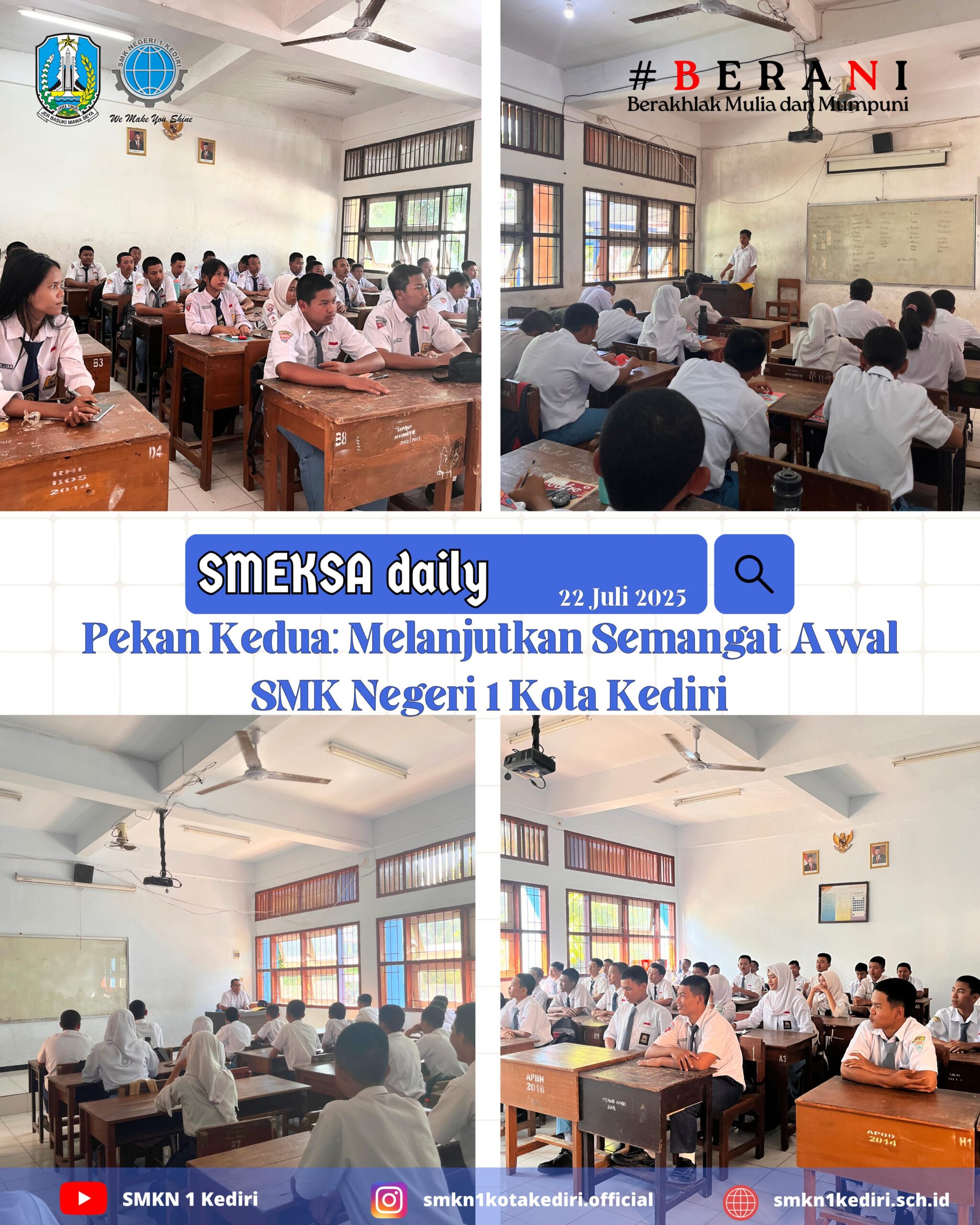 Kediri, 22 Juli 2025 – SMK Negeri 1 Kota Kediri melanjutkan gebrakan motivasi bagi siswa melalui edisi harian “SMEKSA Daily” bertajuk “BERANI: Berakhlak Mulia dari Mampuni”. Program ini fokus pada penguatan karakter dan semangat belajar siswa setelah pekan pertama masuk sekolah.