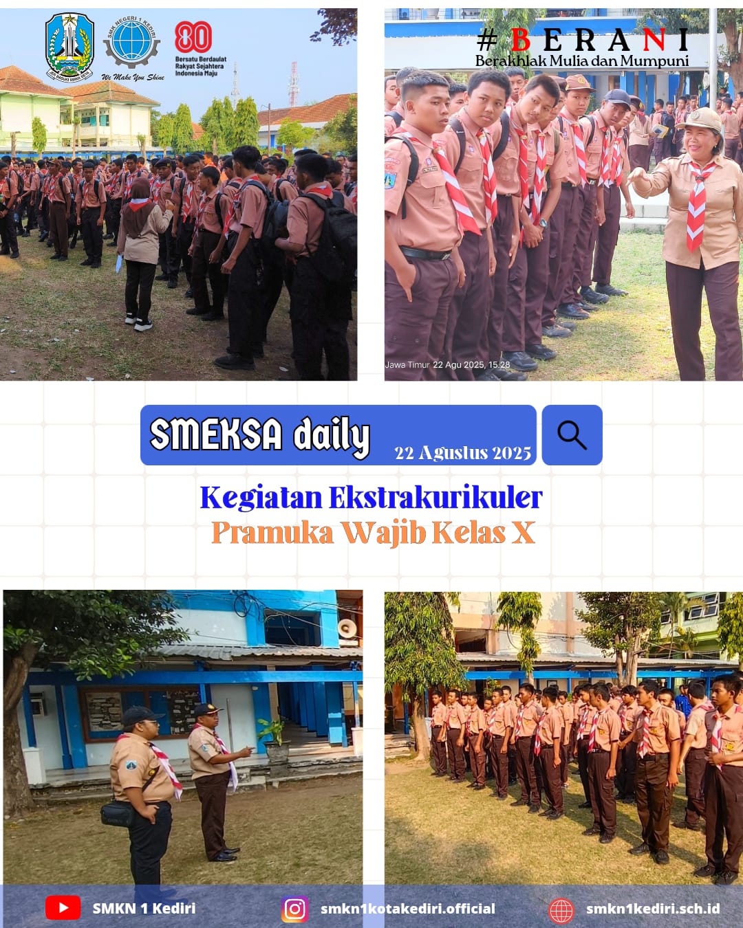 Kediri, 22 Agustus 2025 – SMK Negeri 1 Kota Kediri kembali mengadakan kegiatan ekstrakurikuler Pramuka Wajib untuk siswa kelas X setiap hari Jumat, pukul 15.30 hingga 16.30 WIB. Kegiatan yang berlangsung di lingkungan sekolah ini di dampingi oleh wali kelas masing-masing serta 10 pembina Pramuka yang kompeten.