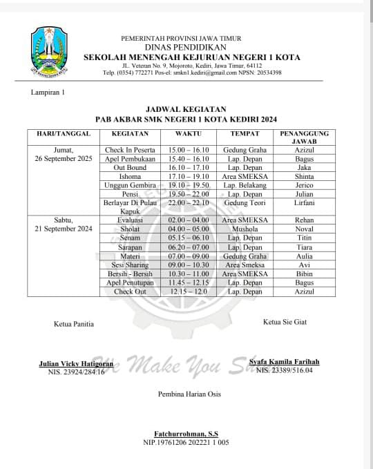 Kediri, 29 September 2025 – SMKN 1 Kota Kediri menjadi saksi semaraknya acara Penerimaan Anggota Baru Seluruh Organisasi yang berlangsung pada Jumat, 26 September 2025 pukul 15.30 hingga Sabtu, 27 September 2025 pukul 12.00. Acara ini dihadiri oleh ratusan siswa yang bersemangat mengikuti serangkaian kegiatan menarik.