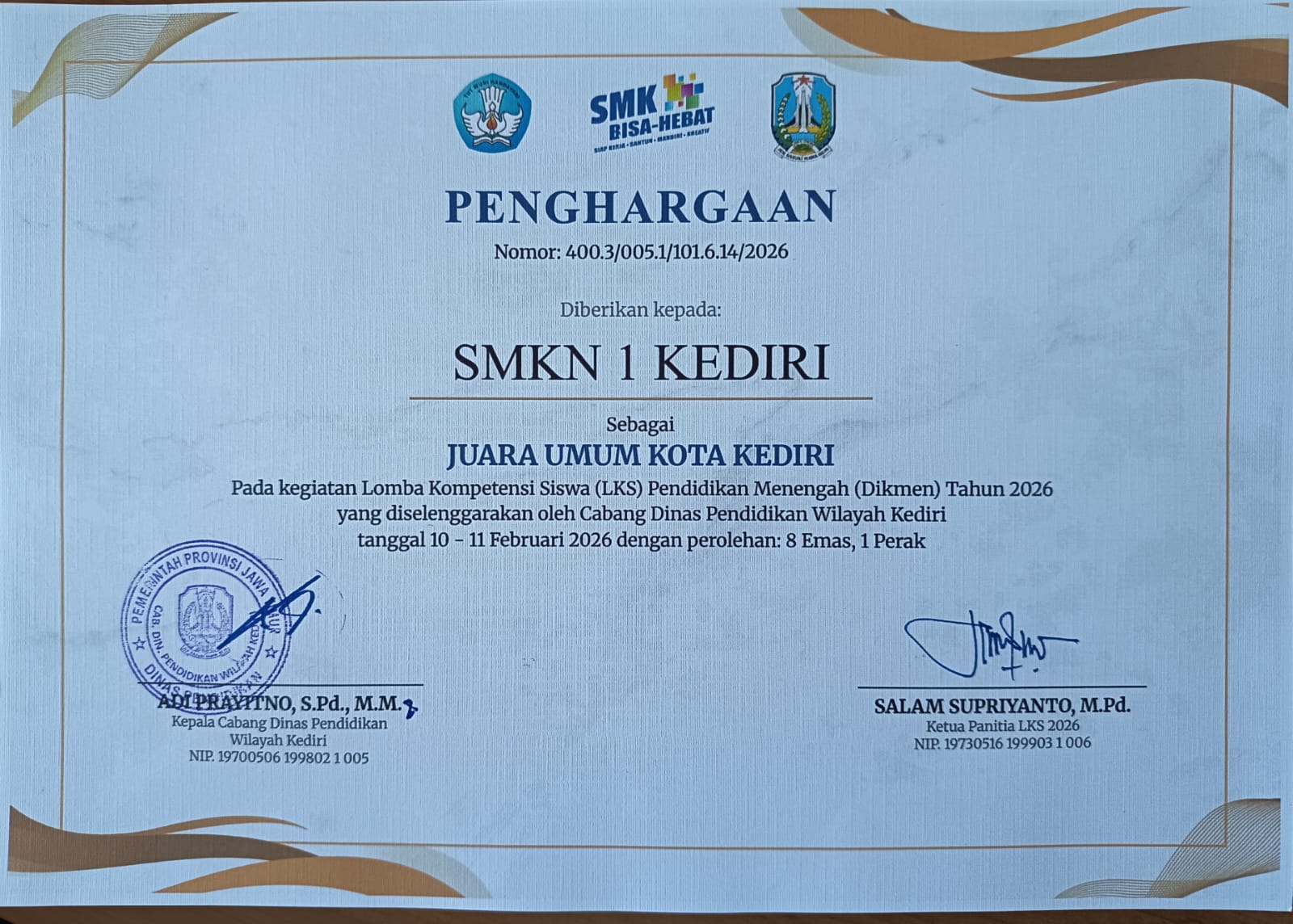 KEDIRI – SMK Negeri 1 Kota Kediri kembali mengukuhkan posisinya sebagai sekolah unggulan di wilayah Jawa Timur khususnya di wilayah Kediri. Dalam ajang bergengsi Lomba Kompetensi Siswa (LKS) tingkat Cabang Dinas Pendidikan (Cabdin) Wilayah Kediri yang baru saja usai, sekolah ini resmi dinobatkan sebagai Juara Umum.